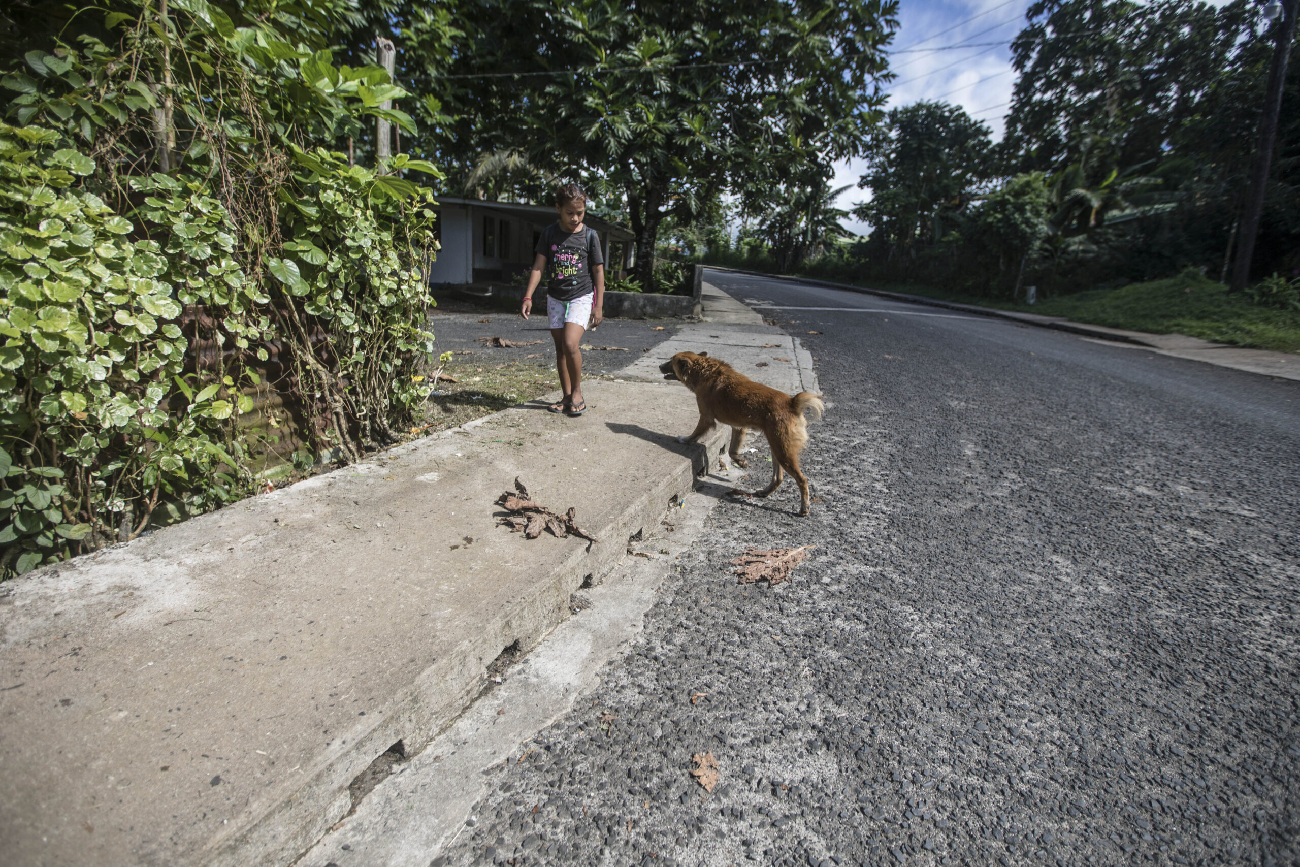 Kolonia är ett såntdär ställe där alla barn vinkar och där någon genast försöker lura in dig i en bil. När en dam i grön klänning, med en grön hawaiikrans i håret och en runt backspegeln i en väldigt gammal och rostig grön bil vill ge mig skjuts hoppar jag såklart in. Den bilden vill man inte missa. Det dröjer fem minuter, sen kommer utläggningen om att hon behöver pengar, om jag förstår det rätt för att kunna checka in en extra väska på flyget till Hawaii nästa vecka, dit hon ska på en läkarbehandling. Alla är väldigt, väldigt fattiga, säger hon. Det finns inga jobb, ingen jobbar.